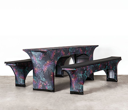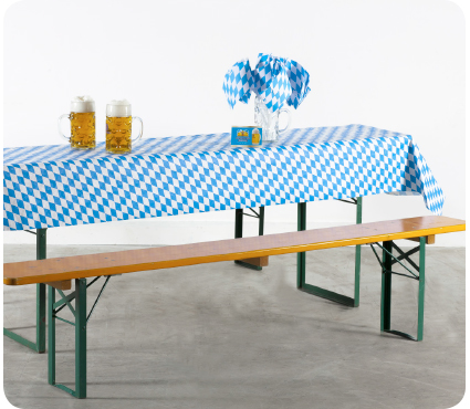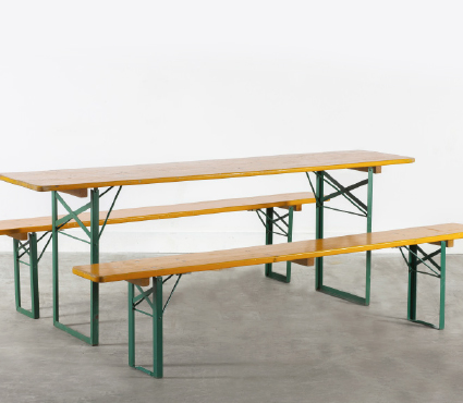 Beschreibung:1 Tisch (2,20 m x 0,50 m), 2 Bänke (2,20 m x 0,25 m),Platz für 10 Personen,Auch mit weißen und schwarzen Hussen erhältlich.